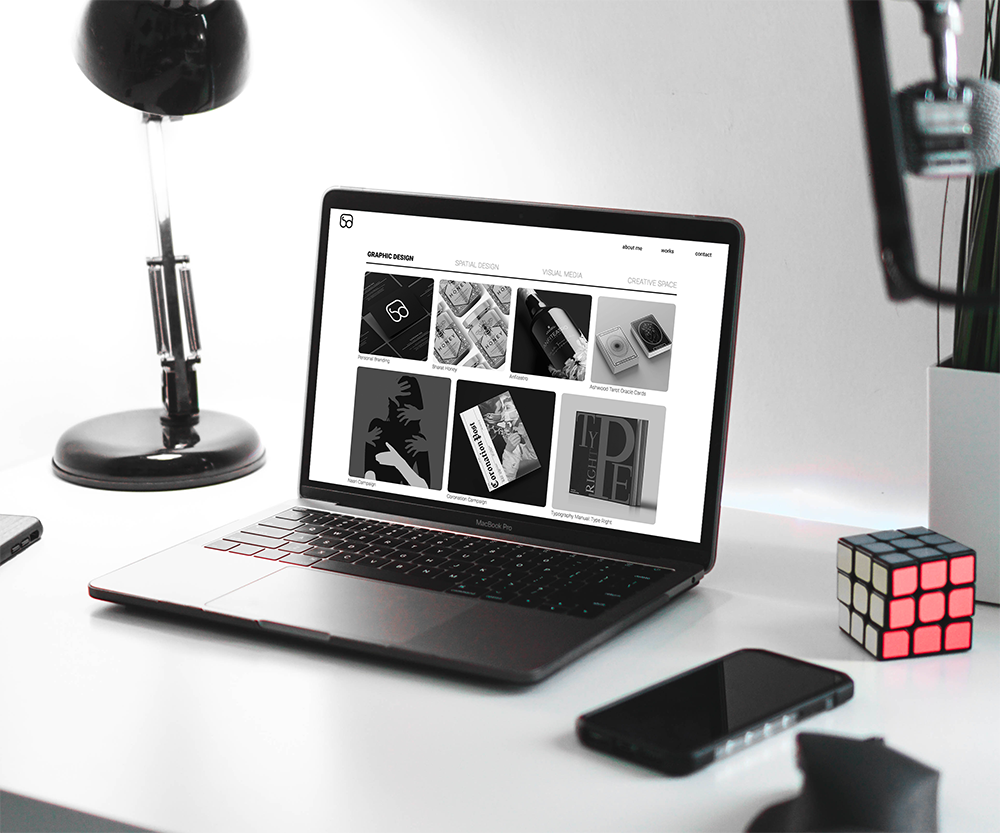 The main idea was to showcase the designer's works and background through a minimalist black and white user interface.