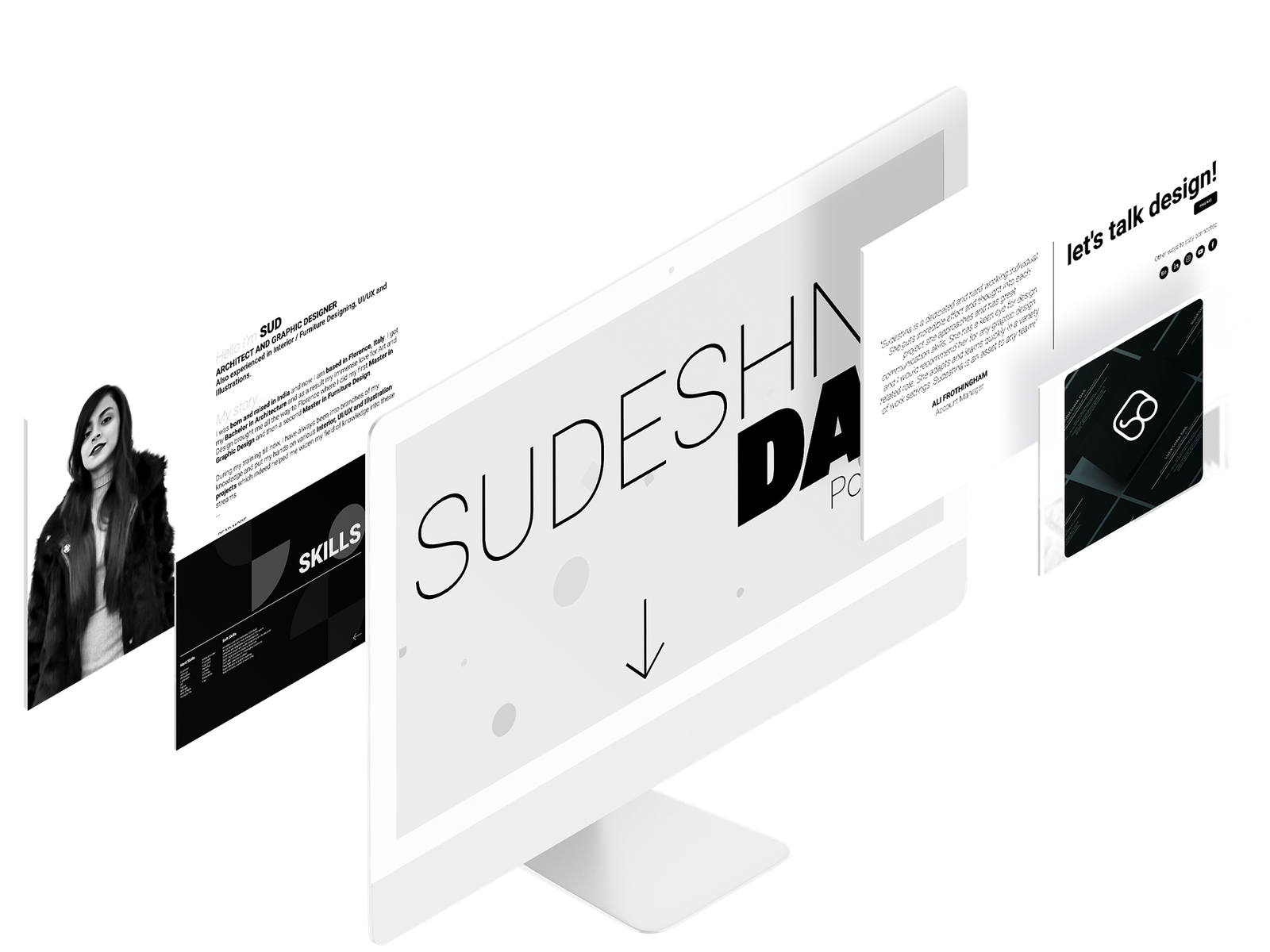 The main idea was to showcase the designer's works and background through a minimalist black and white user interface.